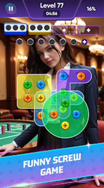 Romance Screw Girl: Twist & Sparkle är ett engagerande och avkopplande pusselspel som utmanar spelare med skruvvridande utmaningar. Spelet går ut på att rotera, ta bort och matcha skruvar i rätt ordning för att klara av olika nivåer. Reglerna är lätta att förstå, vilket gör det tillgängligt för spelare i alla åldrar. Varje pussel kräver logik och strategi, vilket gör det till en utmärkt aktivitet för att träna hjärnan och förbättra koncentrationen under ledig tid.